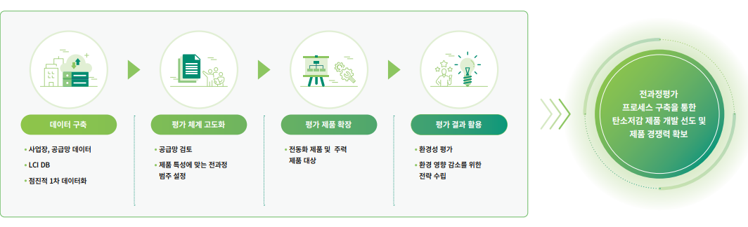 5. 전과정평가 프로세스 구축 계획 제품의 전과정평가 결과를 바탕으로 각 단계별 환경 영향을 줄이기 위한 전략을 수립하고 이행하여 탄소중립에 기여하고자 합니다.